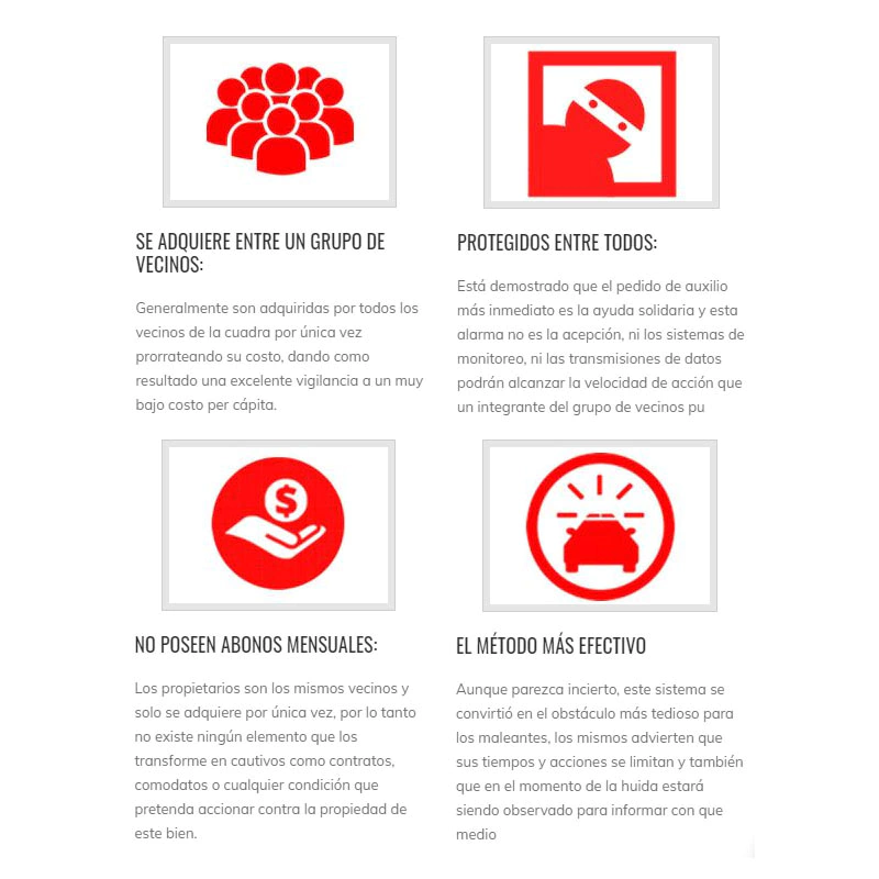 * Alertar a la cuadra con un sonido potente de sirena o pitido de cualquier movimiento extraño en su cuadra.